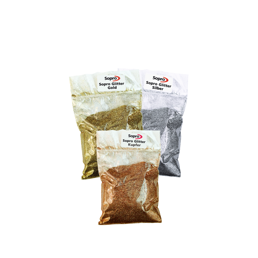 Kovové třpytky lze smíchat se všemi barvami Sopro DF 10 Design Fuge Flex, SoproTitec-Fuge plus a epoxidovou spárovací hmotou DFX, čímž dosáhnete lesklý estetický kovový efekt .