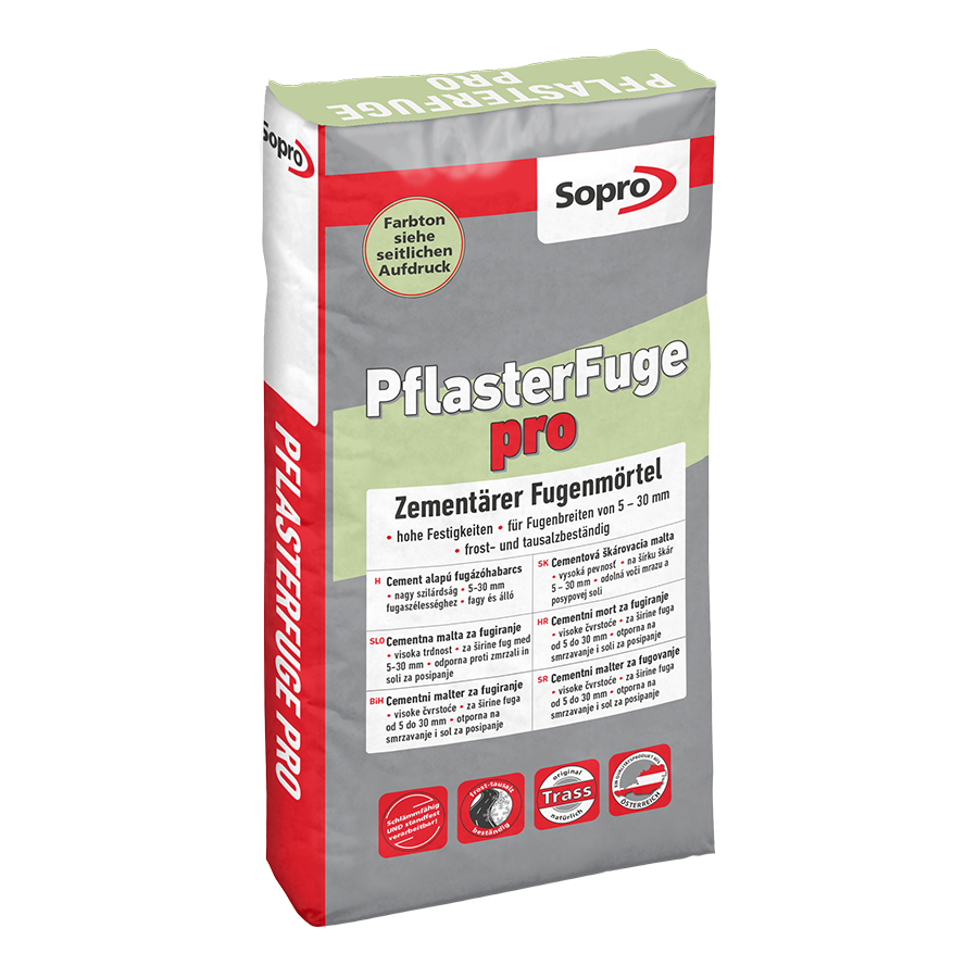 Suchá hotová cementová hmota s trasou pro spárování dlažby a dlažebních desek z betonu nebo přírodního kamene. Pro šířky spár od 5 do 30 mm. Sopro PflasterFuge pro znamená vysokou pevnost, dobrou přilnavost , nízkou absorpci vody a pěkný, přirozený vzhled povrchu.